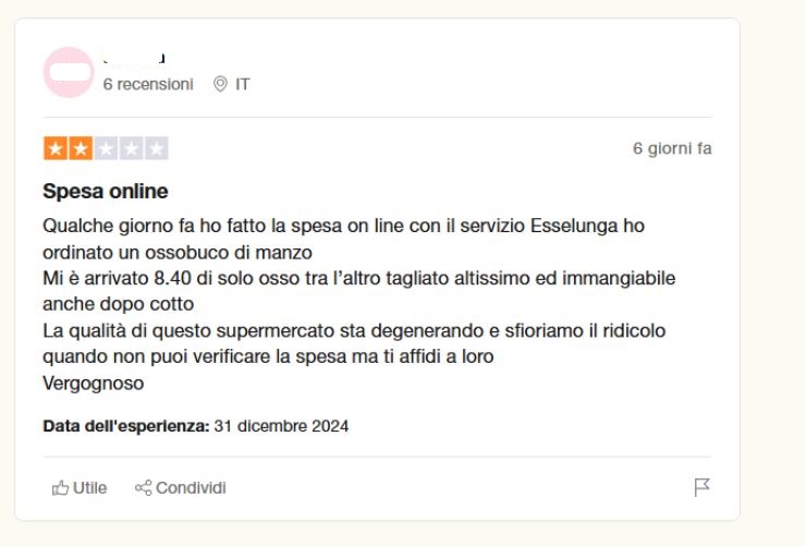 Nonostante Esselunga si confermi ai primi posti tra i supermercati migliori, una disavventura può capitare. In questo caso la persona interessata racconta di non essersi trovata bene con uno degli utilissimi servizi offerti da Esselunga: la spesa a domicilio. La sua recensione è pubblica, pubblicata e visibile a tutti sul sito Trustpilot.