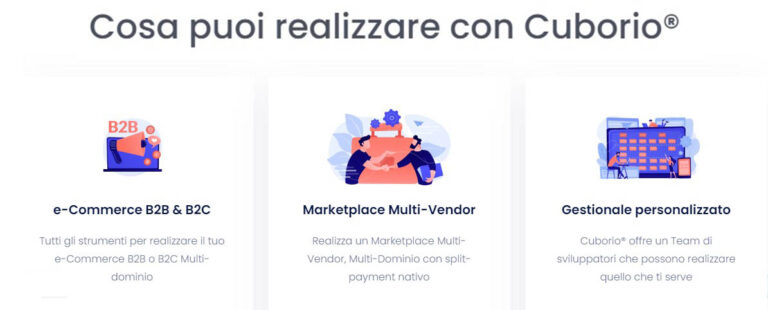 Cuborio offre una soluzione completa e affidabile per la creazione di negozi online. Grazie al nostro software per creare ecommerce, le aziende possono espandere le proprie vendite online in modo rapido e efficace, aumentando la loro credibilità e reputazione. Oltre alla parte tecnica, offriamo anche servizi di brand building, digital marketing e digital PR, che contribuiscono a far crescere le vendite e la visibilità del marchio. Con Cuborio, le aziende possono contare su un team di professionisti del settore che li supporta in ogni fase della creazione e gestione del loro e-commerce.